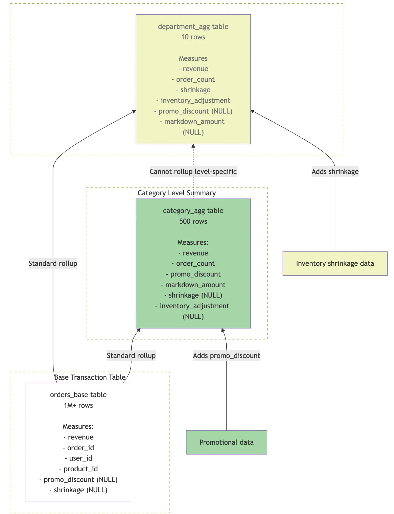 But more significantly they also needed all of this to support a number of measures that existed only at specific aggregation levels, for example, promotional discounts tracked at category level and shrinkage recorded at department level, as shown in the diagram below.
