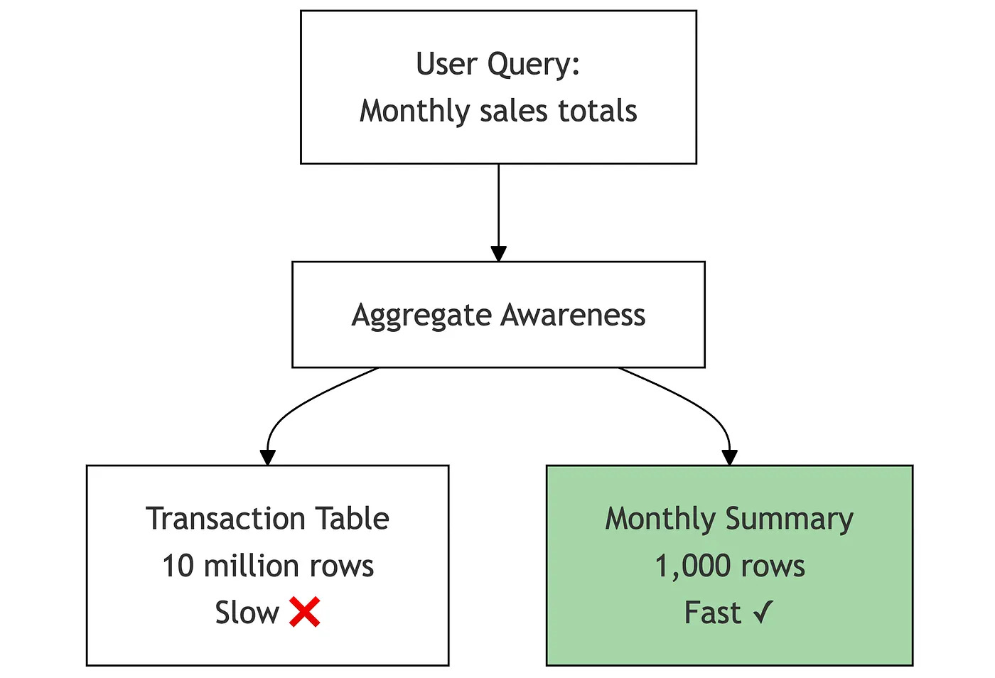 The trade-off again though is maintenance complexity as you’ll need to manually update the routing conditions whenever measure availability changes, whereas native aggregate awareness would handle standard measures automatically (though it still wouldn’t handle level-specific measures at all, hence this more complex and manual approach.