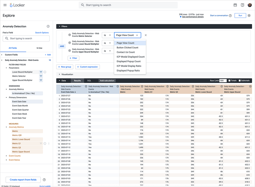 Now that we’ve setup the LookML view and separately, added it as an explore in your LookML model, you can open-up the Explore interface in Looker and start to analyze the history of anomalies in your event data.