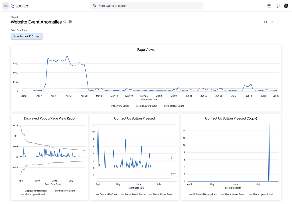 While the Explore feature is excellent for ad-hoc analysis, you can also build a monitoring dashboard that gives you an at-a-glance view of all your critical anomaly-detection metrics. In the screenshot below you can see a simple example of an Anomaly Detection Dashboard in Looker, to which you could also add alerts to tell us, for example, when page views or popup display frequency ratios yesterday were anomalous compared to the norm.